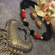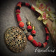 Silver crescent collar with intricate work and blue terra-cotta flower beads and red wooden beads hang from a red beaded necklace.