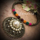 Tondra's once again brings you a unique n elegant surprise!Hand painted on a tree bark, a beautiful wooden pendant of baby Lord Ganesh on Ma Durga's lap, strung on red green yellow beaded necklace.
