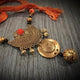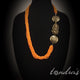 Silver crescent collar with intricate work and blue terra-cotta flower beads and red wooden beads hang to give that garden-y look. Different shades of blue-bluish green seed beads strings complete the necklace.