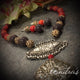 An extraordinarily beautiful brass n copper pendant hanging from a orange, black n wooden beaded necklace.