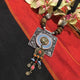 An ethnic Sikkimese/Tibetan vintage mosaic inlay metal pendant displays inlay work in green and red on a black base, with a vintage finish. This kind of work is typical of the traditional jewelry of Sikkim, the beautiful hilly region at the foothills of the Himalayas. Strung on red/green mix thread the necklace looks really rich and beautiful.