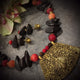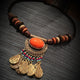 Antique bronze crescent collar necklace with an antique bronze cute owl face and feathers pendant both dangling from a wooden beaded necklace with colored and gold spacer beads.