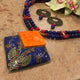 A simple yet beautiful rustic silver Nepalese handcrafted mosaic turquoise inlaid focal Tibetan teardrop pendant hanging from a blue thread necklace.