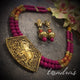 A large antique silver leaf pendant hanging from a black thread necklace with black multifaceted bead and real coral beads. Very classy!