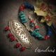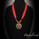 An antique bronze and silver mix spearhead shaped pendant on a orange and maroon beaded necklace.