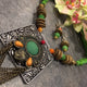 An antique gold tribal pendant dangling from a light and dark blue opaque charlottes Czech glass seed bead necklace, perfectly customized to match the saree for my friend!