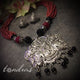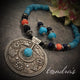 A large German silver ethnic pendant with dangling coins strung on a red-white-black bead necklace.