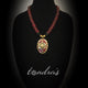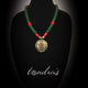 A beautiful blue/black antique bronze Tibetan pendant strung with beautiful peach and bluish purple beads. Wear with Western outfit too!