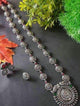 A really big purple and orange Tibetan pendant strung on seed beads and real coral and antique gold beads.