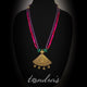 Silver crescent collar with intricate work and terra cotta flower charms with red beads hang to give that fresh look. Peacock shades of blue bead strings complete the necklace.