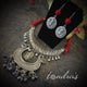 Silver crescent collar with intricate work and terra cotta flower charms with red beads hang to give that fresh look. Peacock shades of blue bead strings complete the necklace.