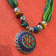 A unique necklace where antique silver, copper and bronze meet. A square oxidized silver pendant with an antique copper plated large medallion pendant and a bronze round bead in the center. A beautiful colorful dangling bronze leaves charm leaves this piece with eternity of uniqueness. It is strung on black/blue color thread. Both black and blue thread are included to wear interchangeably.