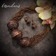 A beautiful Tibetan necklace made with a large copper bead with blue stones embedded and 2 antique bronze beads on either side, all 3 strung on a copper colored multistranded seed bead necklace. Matching earrings included.