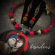 Hand painted in Chicago, on a tree bark, a beautiful wooden pendant of Radha Krishna strung on a rudraksh and red blue beaded necklace!